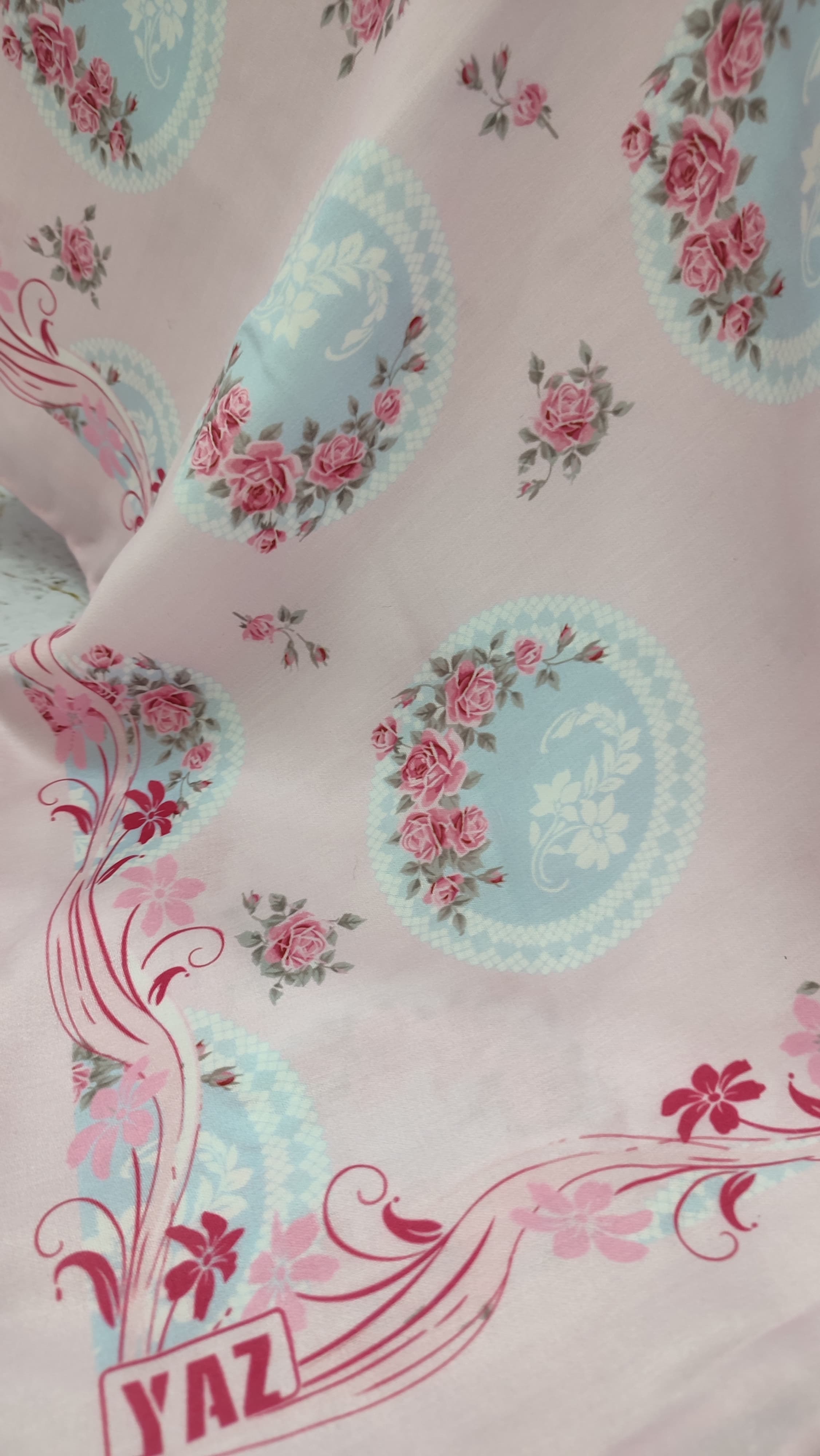 روسری صورتی با گل‌های حلقه آبی عرض ۱۳۵
