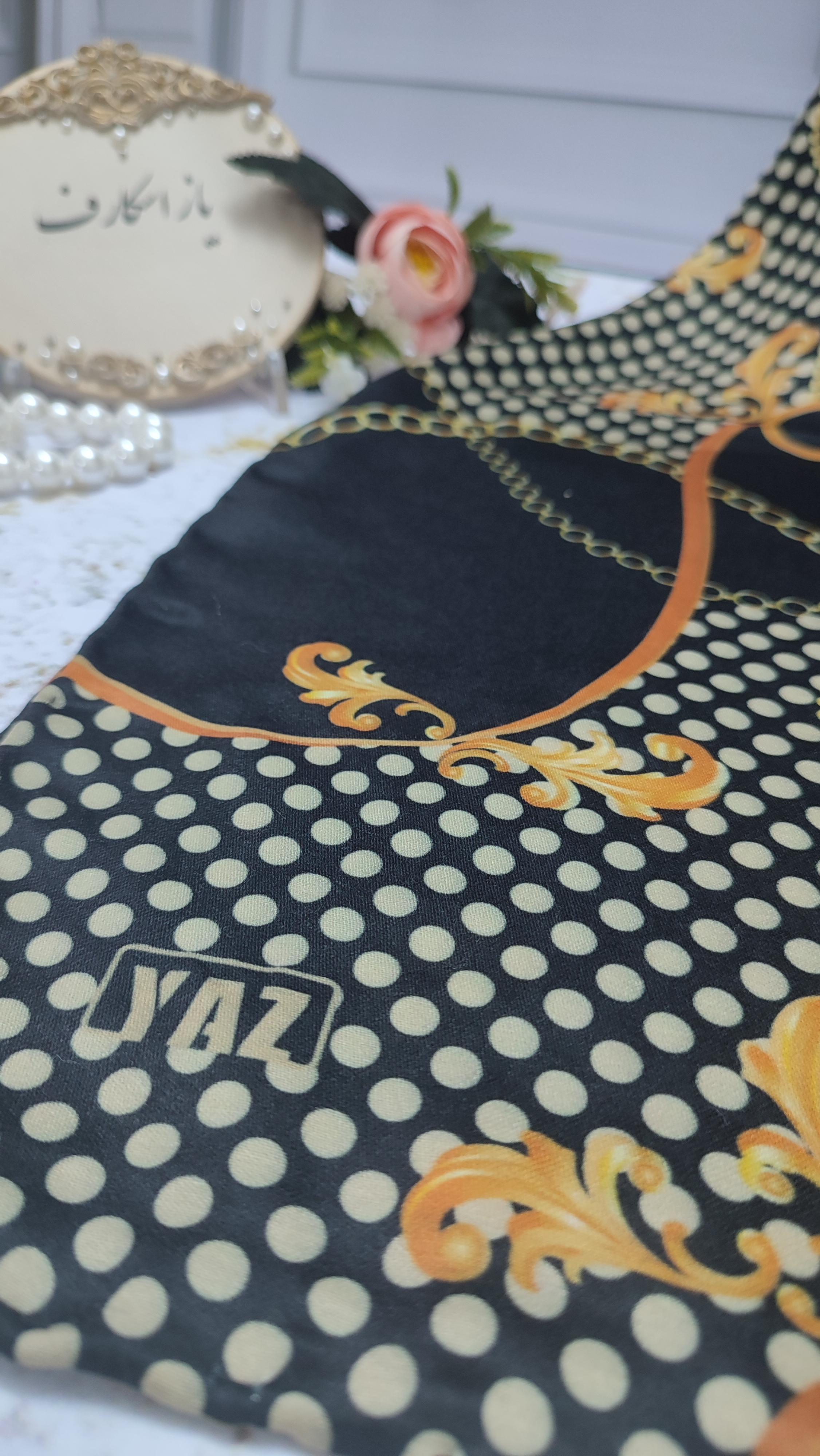روسری مشکی زنجیر سفید خالخالی عرض ۱۳۵