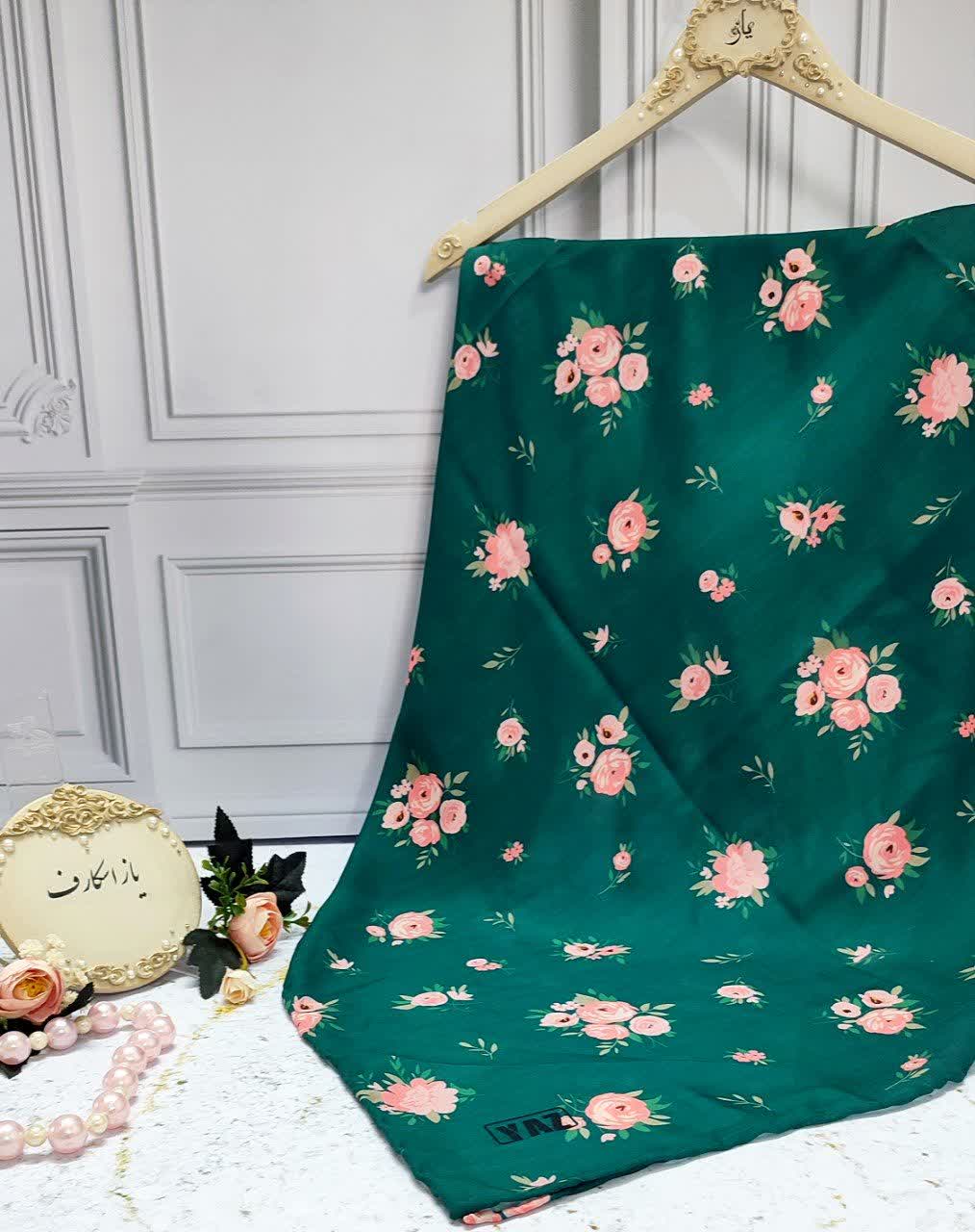 روسری سبز با گل‌های رز گلبهی عرض ۱۰۰ (ست مادر دختری)