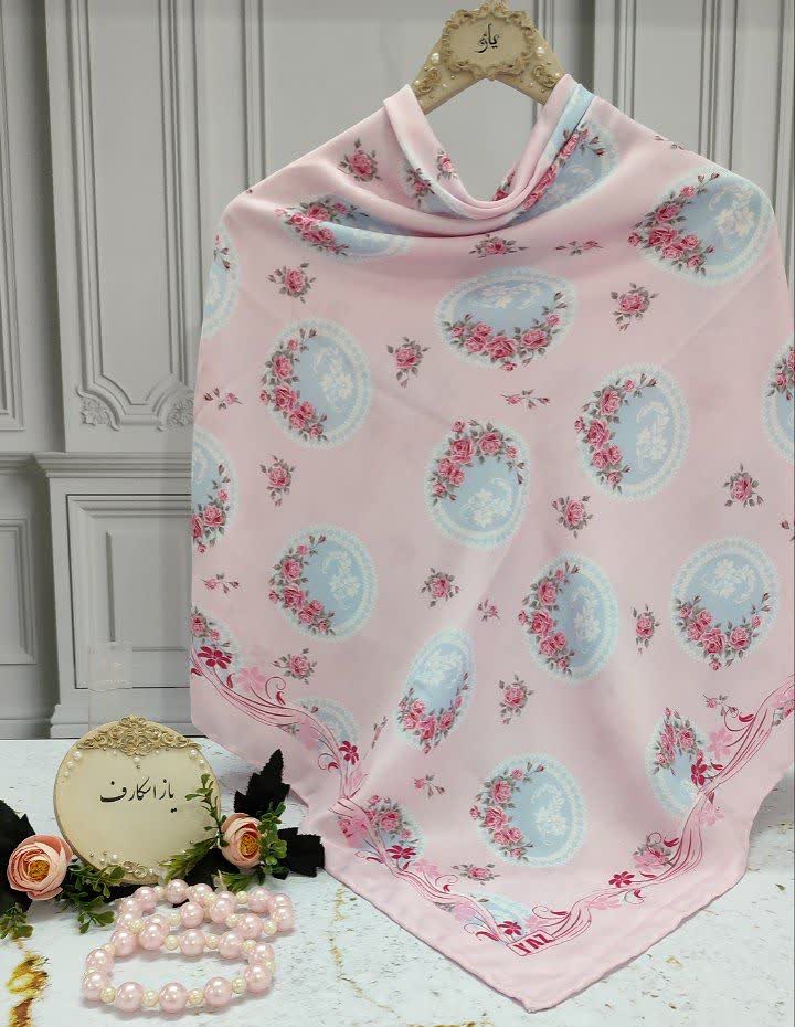 روسری صورتی با گل‌های حلقه آبی عرض ۱۰۰ (ست مادر دختری)